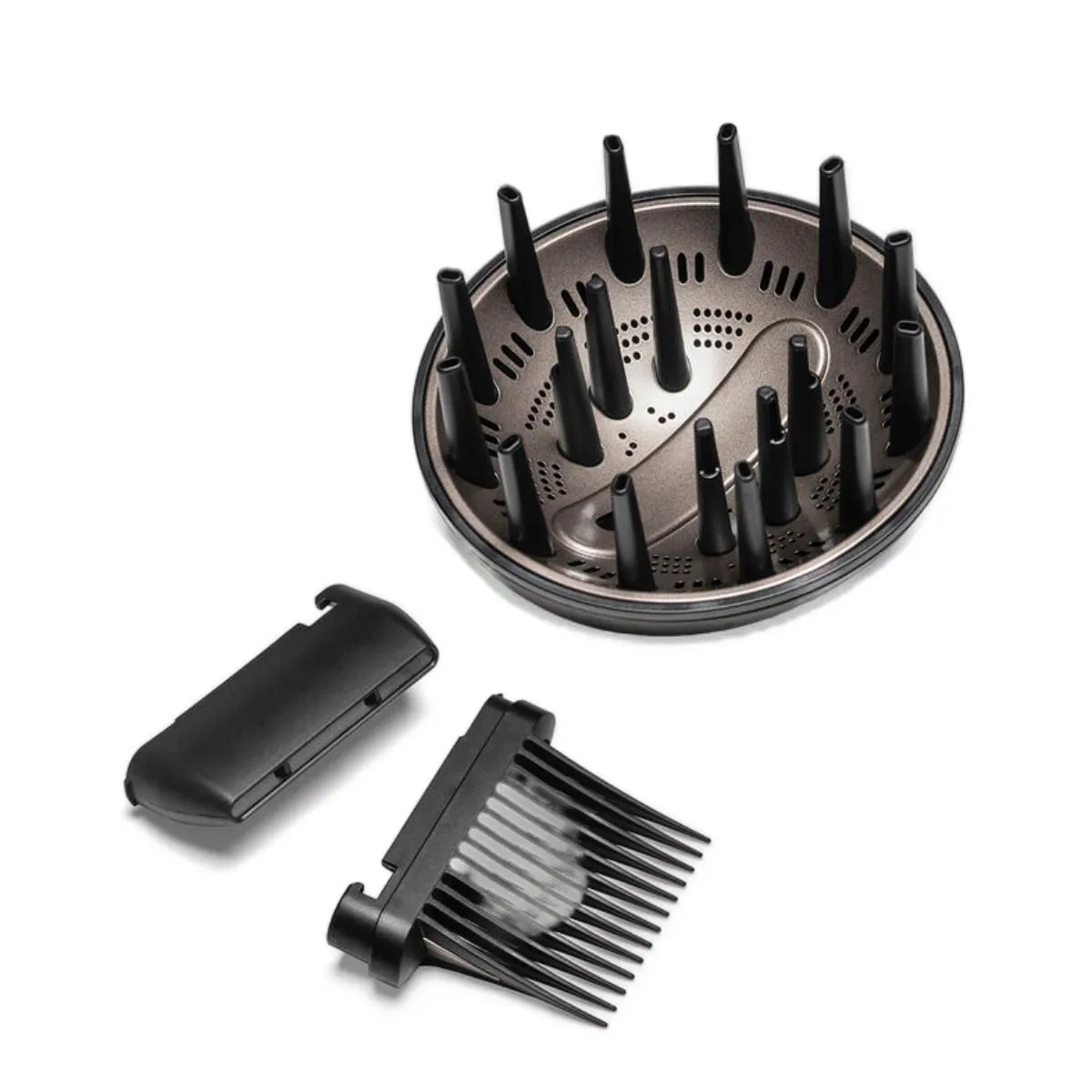Viene con una boquilla concentradora para alisar y un difusor para respetar la forma natural de rizos y ondas.