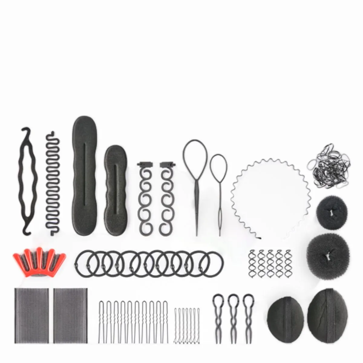 - Herramientas variadas: peines de precisión, cepillo desenredante compacto, un donut de distintos tamaños y una selección de horquillas y pasadores para diferentes tipos de recogidos.