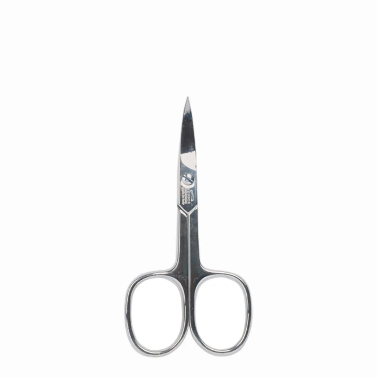 Tijera curvada de acero inoxidable, filo preciso y mango ergonómico. Ideal para manicura y cutículas, acabado profesional y duradero.